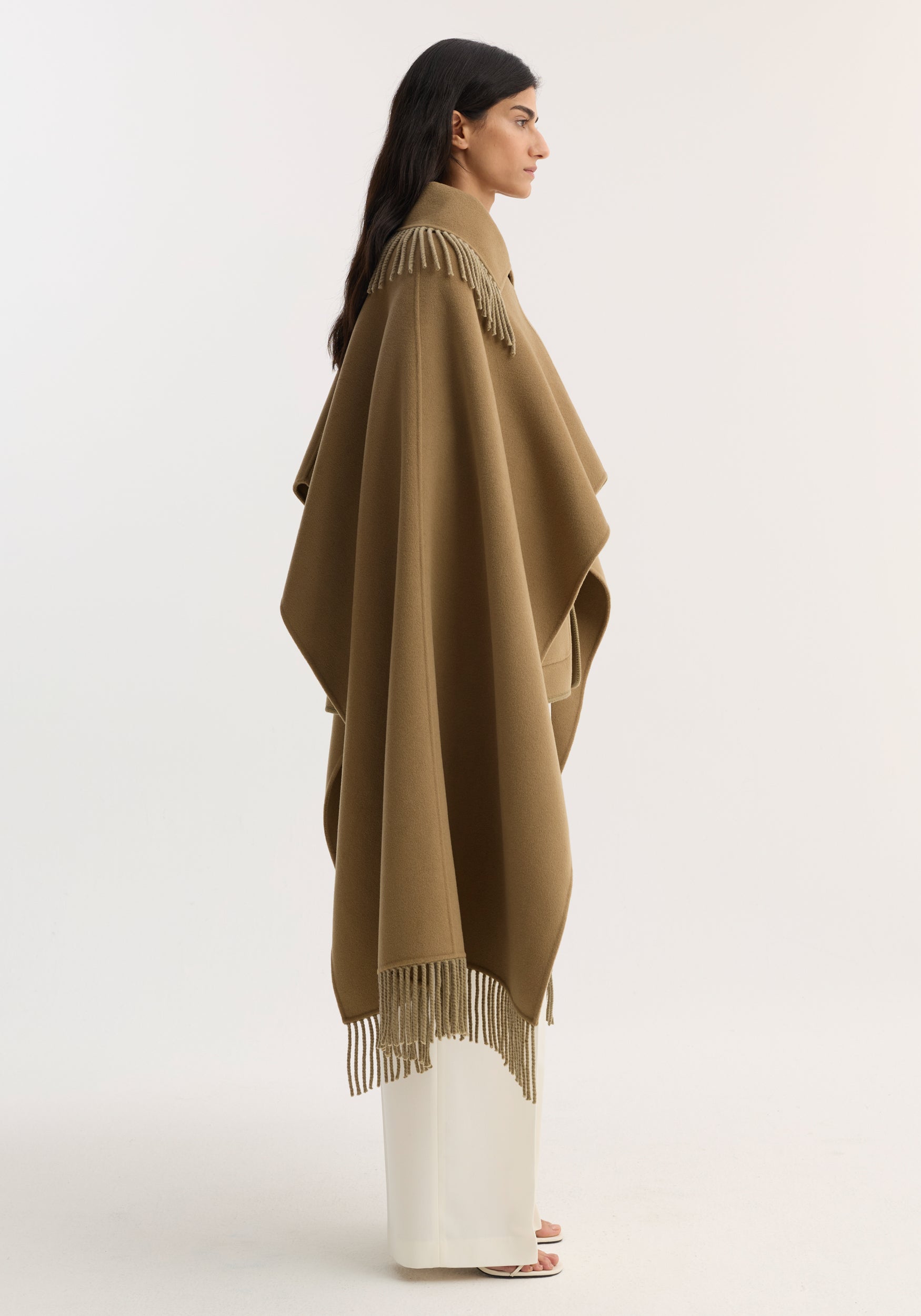 A refined layering piece crafted from a soft wool–cashmere blend, this double-faced poncho is finished with long fringed edges. Designed to drape effortlessly, it offers warmth with a sculptural, elegant silhouette.