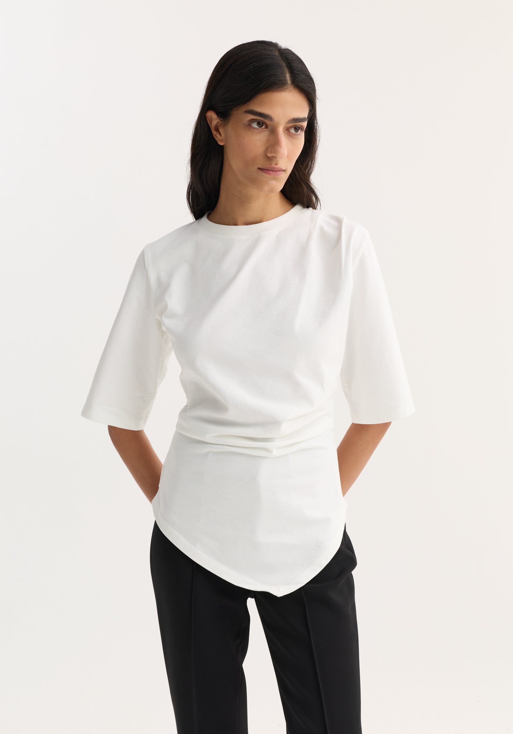 - Twisted asymmetrical design, fitted waist, elbow-length sleeves