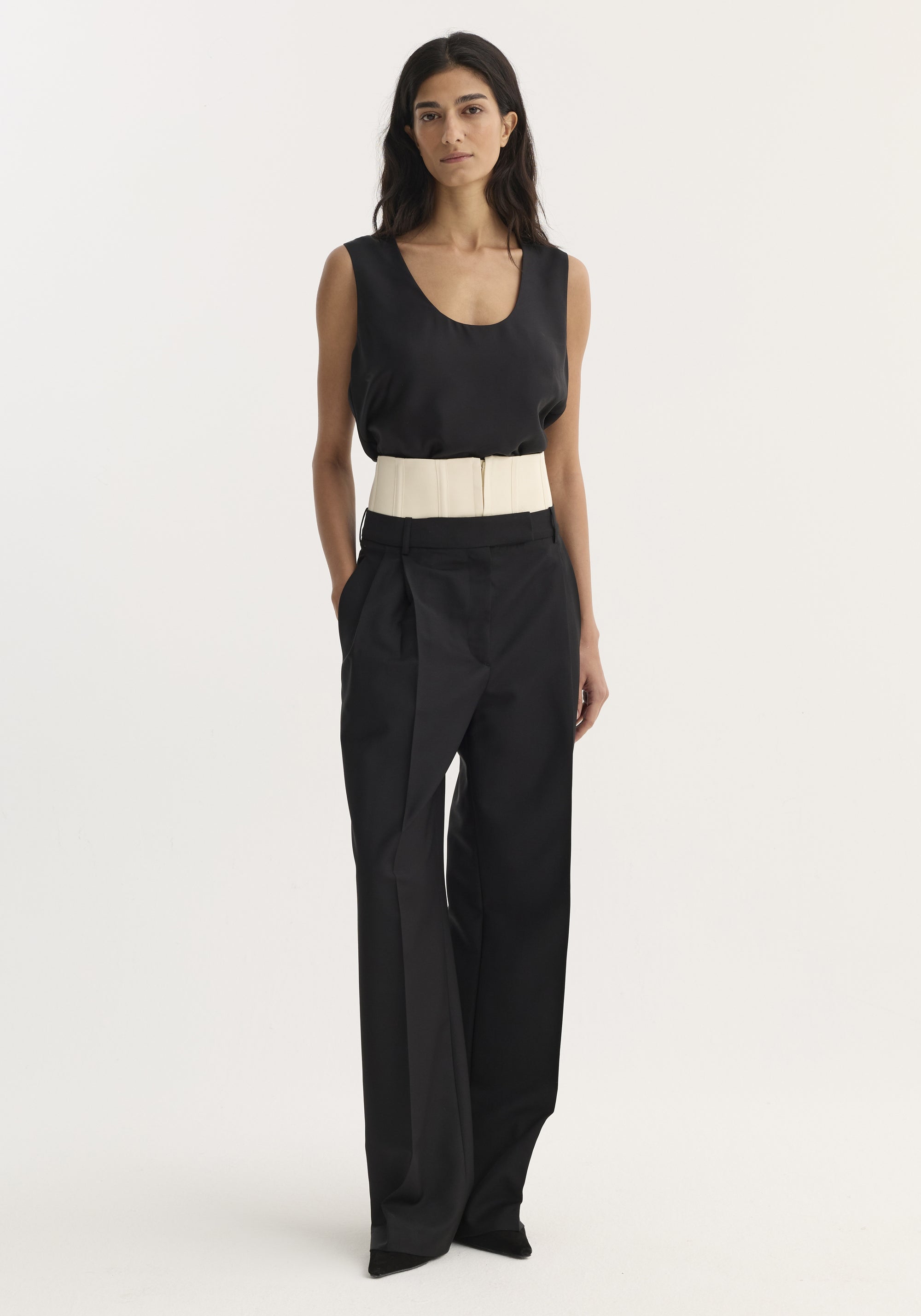 | Our classic mid-waist tailored trousers, reimagined with a structured corset detail that rises above the traditional waistband. The boned corset sits above the trousers and is finished with a classic hook and eye closure. An elevated take on a wardrobe essential. Crafted from wool woven by a renowned Italian mill specializing in premium tailoring fabrics, this lightweight wool-mohair blend is designed for structure, breathability, and lasting performance. Made with mulesing-free wool, it reflects our commitment to responsible sourcing. - High-waisted, tailored corset, double pleated - The composition is 73% wool 27% mohair - The model is 179 cm and is wearing a size EU 36 - The Corset Trousers will be re-stocked from late October |