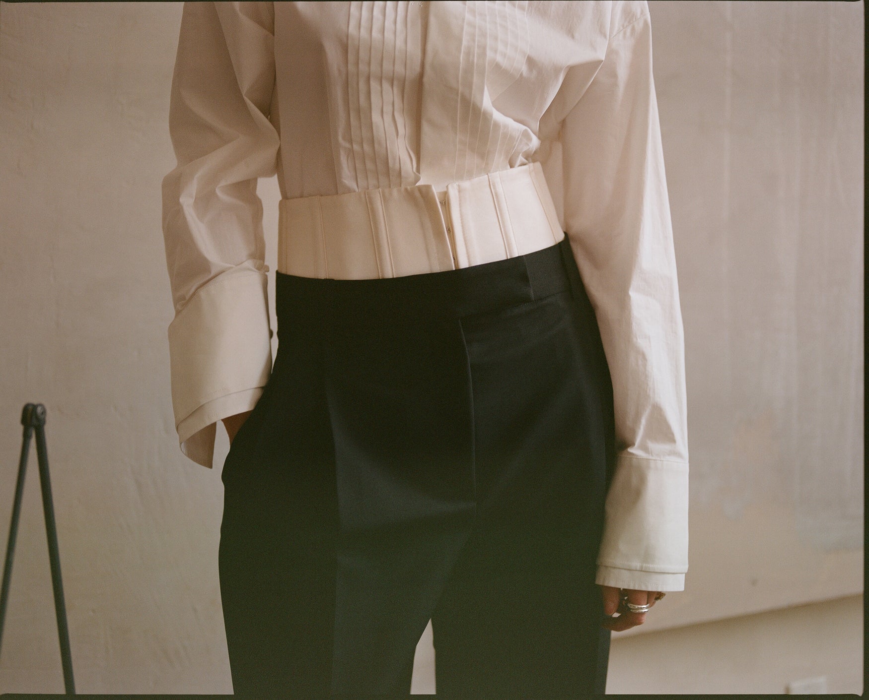 I’m very much a uniform dresser. Because I spend so much time styling others, my own daily wardrobe needs to feel practical and comfortable. A pair of tailored black trousers from Róhe is in constant rotation, I wear them with shirts, blazers, leather. The fabric is uncreasable, so I can pack them in my bag, pull them out the next morning, and they’re ready to go. I also have a beautiful cashmere shawl that I use season after season,  it becomes a skirt, a top, a scarf. Add a brooch and it instantly elevates any look.