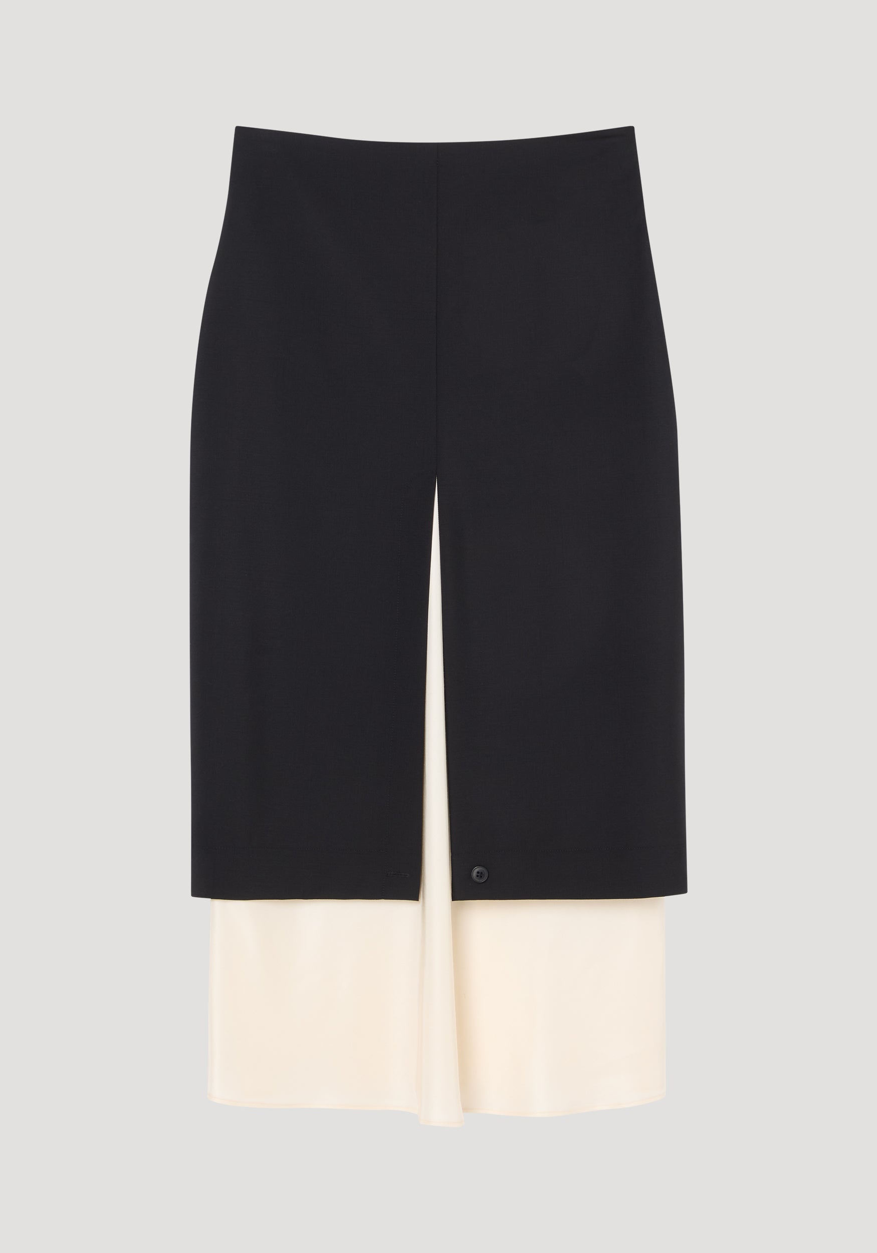 A sculptural reimagining of the classic pencil skirt, a tailored piece designed with a dramatic front slit revealing a flowing contrast underlayer. The upside-down design effect brings elegant movement to a form-fitting silhouette offering contrast in both structure and tone.