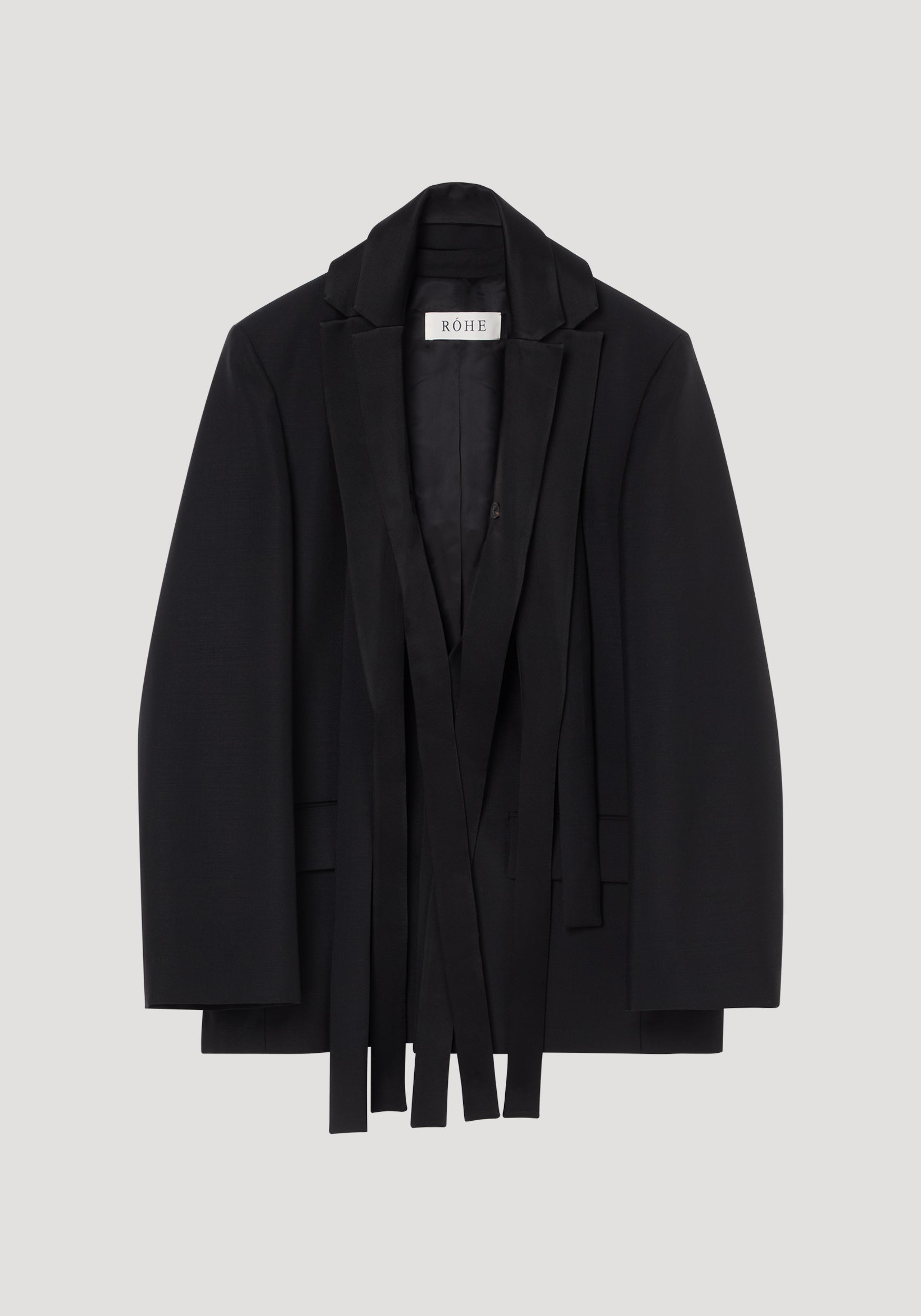 A modern interpretation of tailored suiting, this deconstructed jacket features a separate satin lapel element that can be styled and draped in multiple ways. Finished with a single-button closure, functional pockets and a back vent.