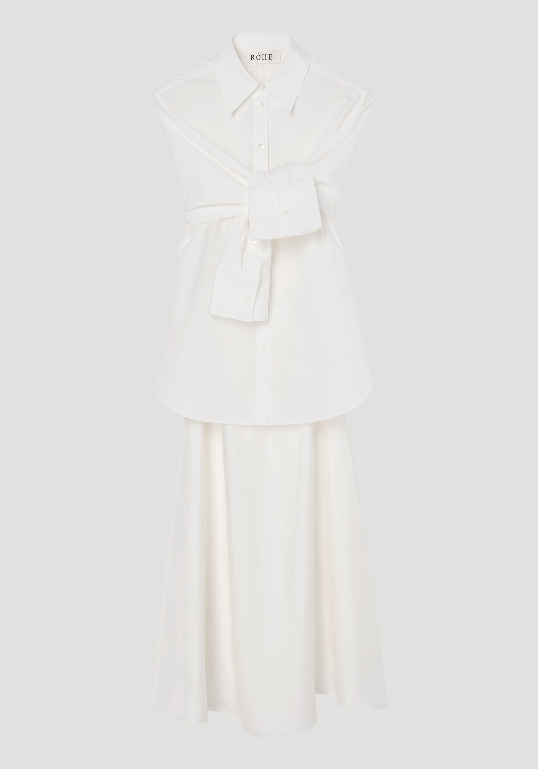 A play on form and contrast comes in this layered gilet-dress reinterpreting the classic shirt through a sculptural and deconstructed design. The dress features open armholes and a buttoned wrap belt to invite styling freedom, while the crisp cotton and airy silk fall into a fluid silhouette that moves with quiet elegance.