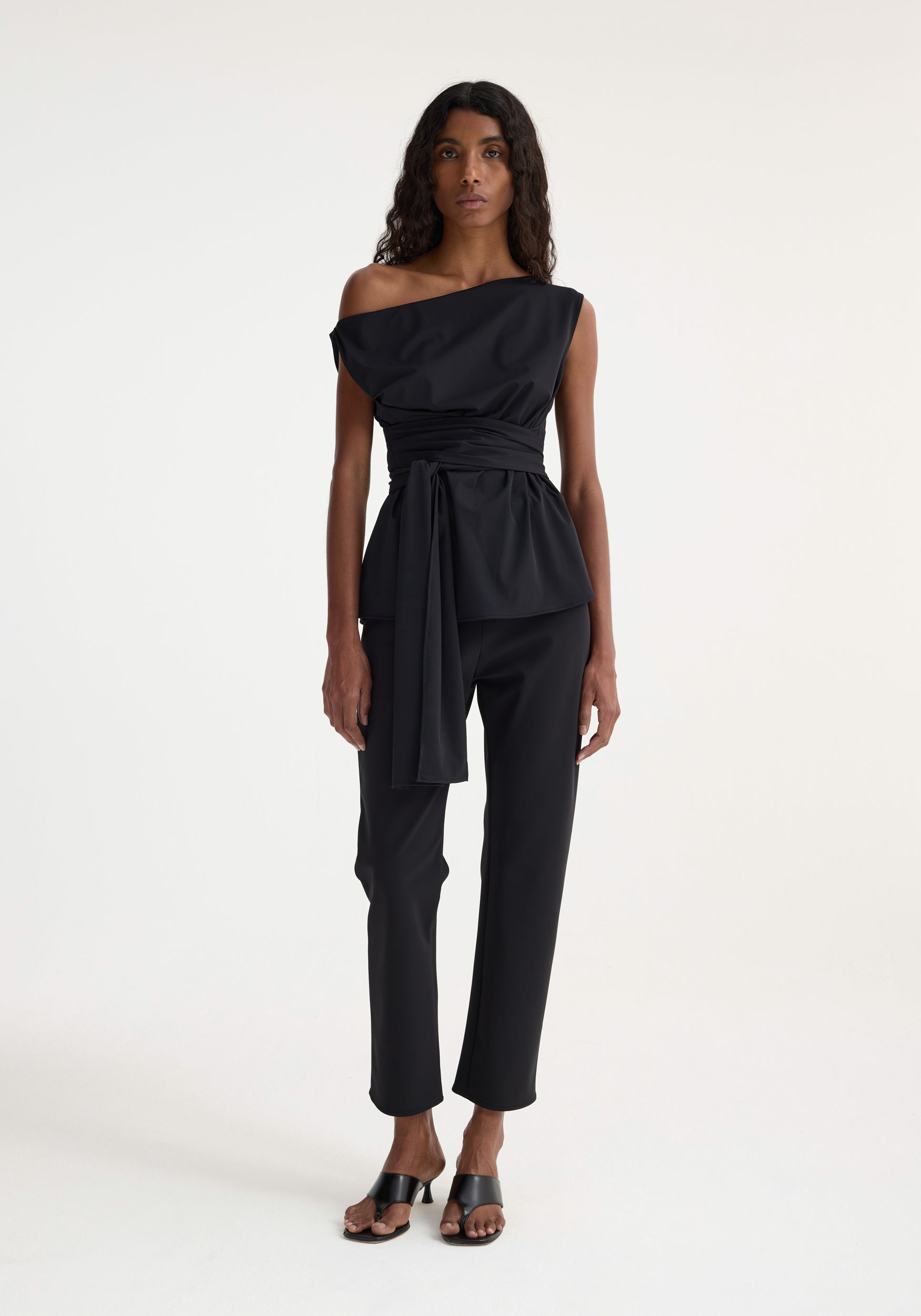 A sleeveless top that drapes off one shoulder, finished with a wrap-around tie that cinches the waist for a softly sculpted silhouette.