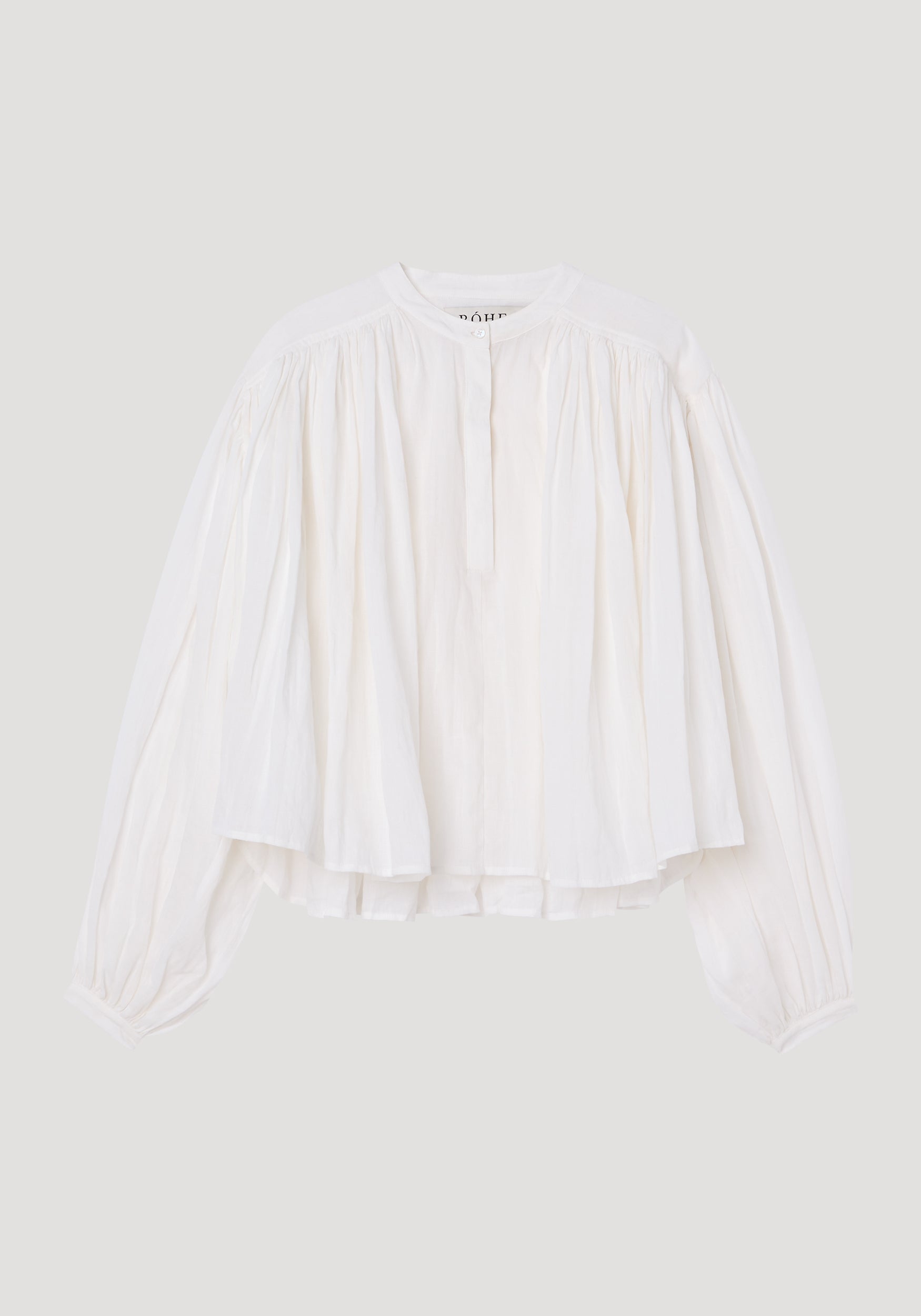 Our pleated top is crafted from an airy light pure ramie quality and features a stand-up collar with soft front and back gathered pleats and long wide balloon sleeves.