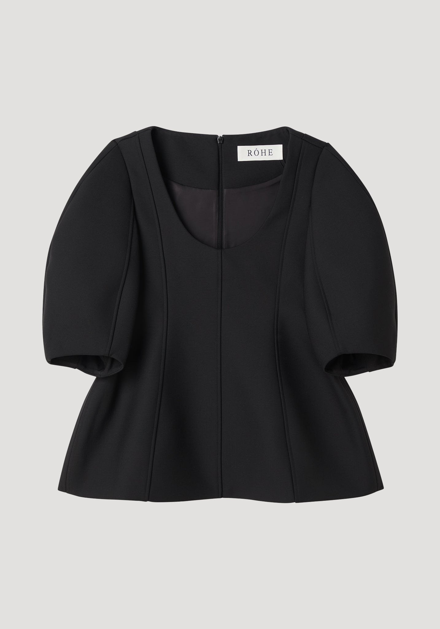 A bold and feminine silhouette, this sculptural top is defined by a deep scoop neckline and voluminous balloon sleeves. The shape flares dramatically from the waist into a structured peplum, accentuated by precise seam detailing for a flattering form.