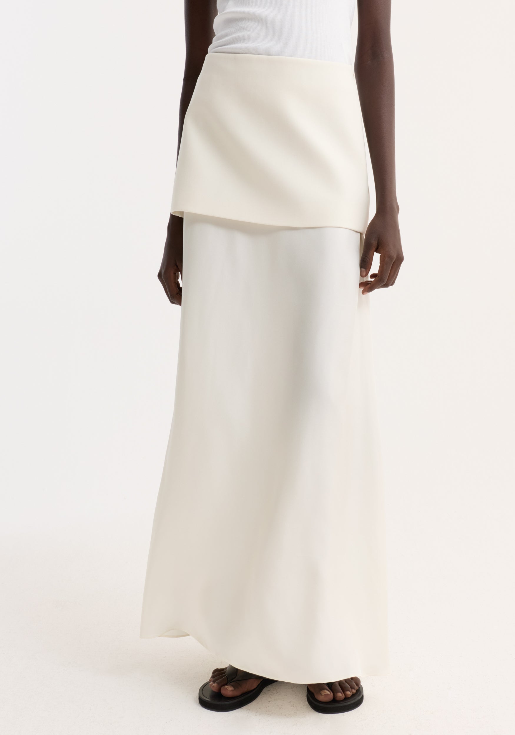 The elegant reimagined skirt blends high-quality fabrics in design. With a fused wool top and a fluid silk underneath, instantly offering a striking contrast in texture and movement. Designed with a high waist and a sculptural flowing silhouette, finished with a blind side seam zip closure for a clean, refined finish.