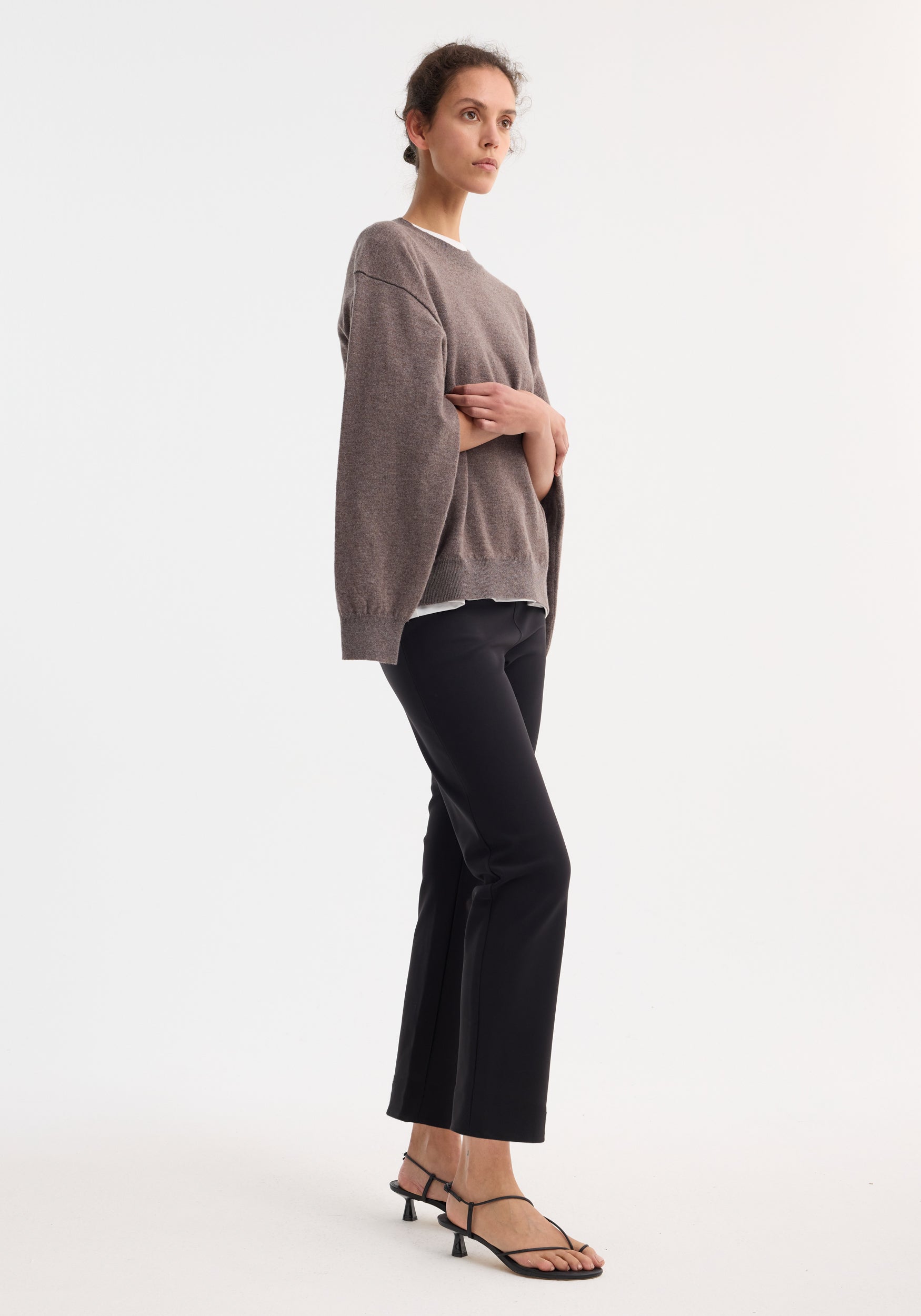 A modern knit piece with versatile styling options, the design features a crew neck and open armholes to be styled with the sleeves tied in front or left loose for a classic silhouette.