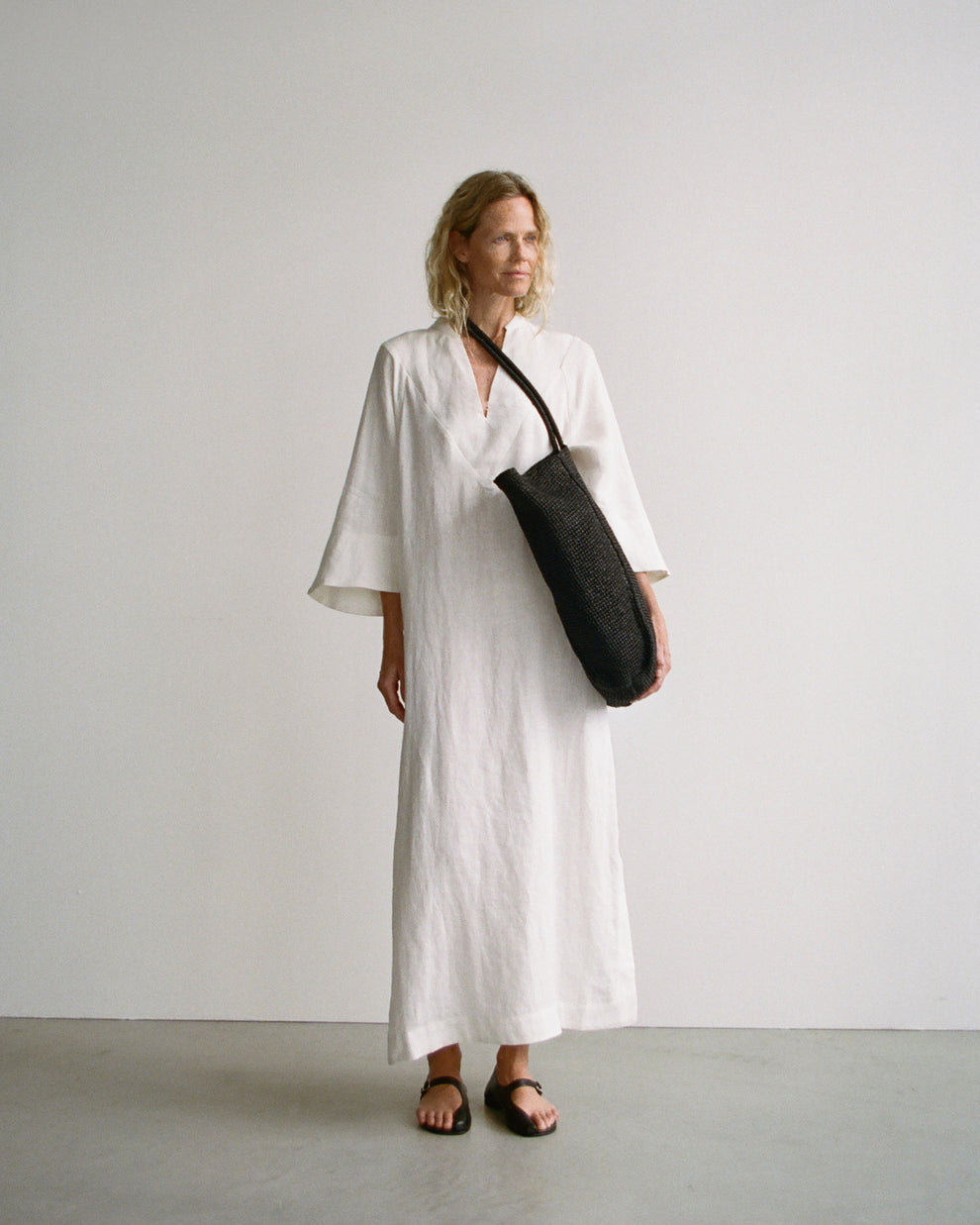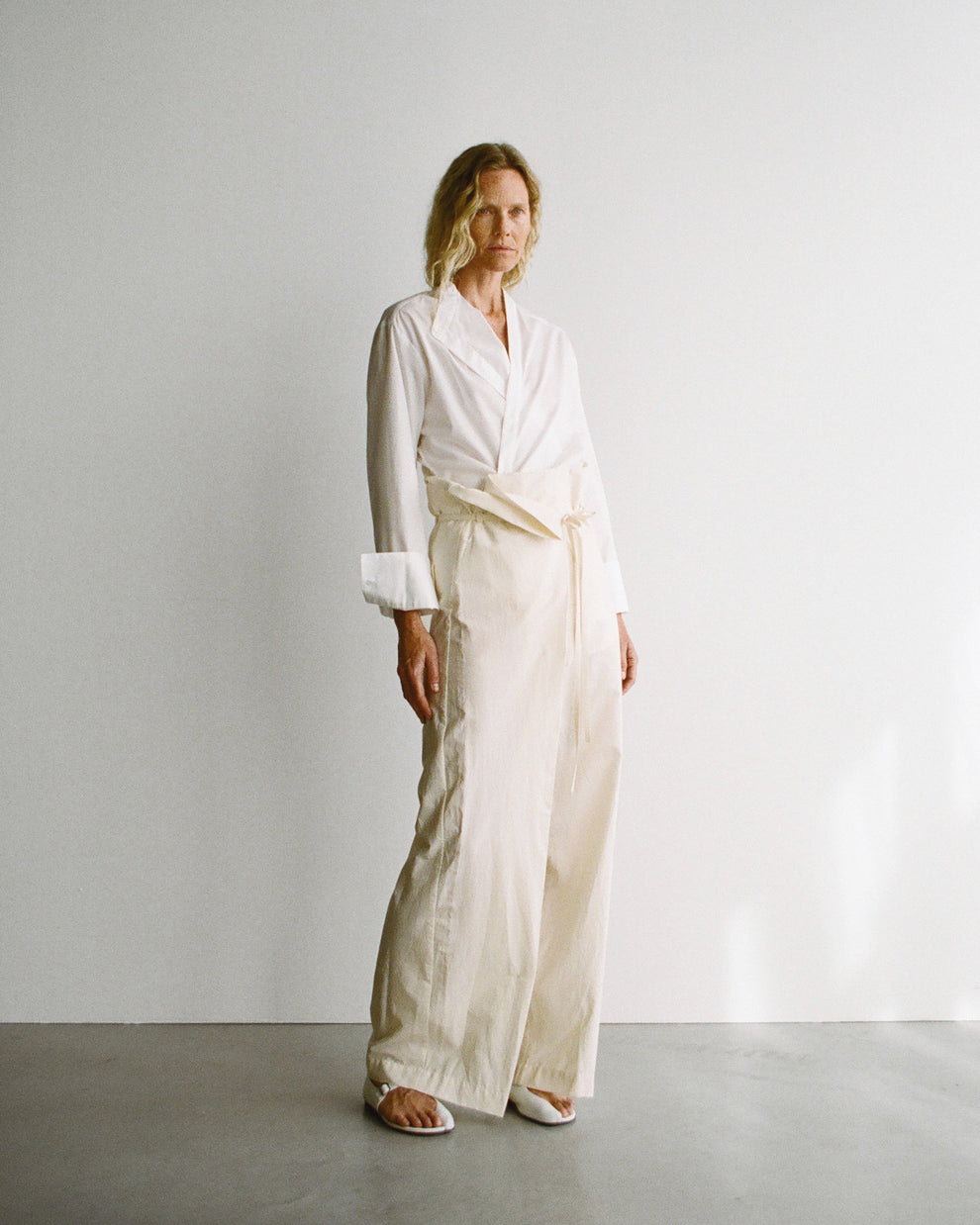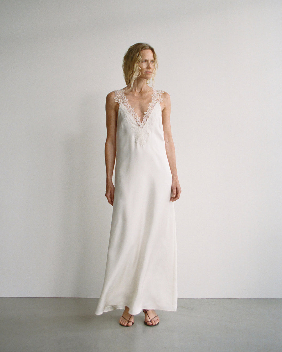 The Spring Summer 25 collection was inspired by the idea of bringing the comfort of homewear into the garden, stepping outside in your lace lingerie or a silky morning robe, appreciating blossoming flowers, the soft green grass beneath your feet, the sun’s warm embrace on your skin, and a gentle breeze that softly moves your garments. Vintage tablecloths and embellished cotton napkins set the stage for a picnic under the open sky, creating an intimate tableau where family and friends come together to enjoy seasonal produce, share time, and create cherished memories.
