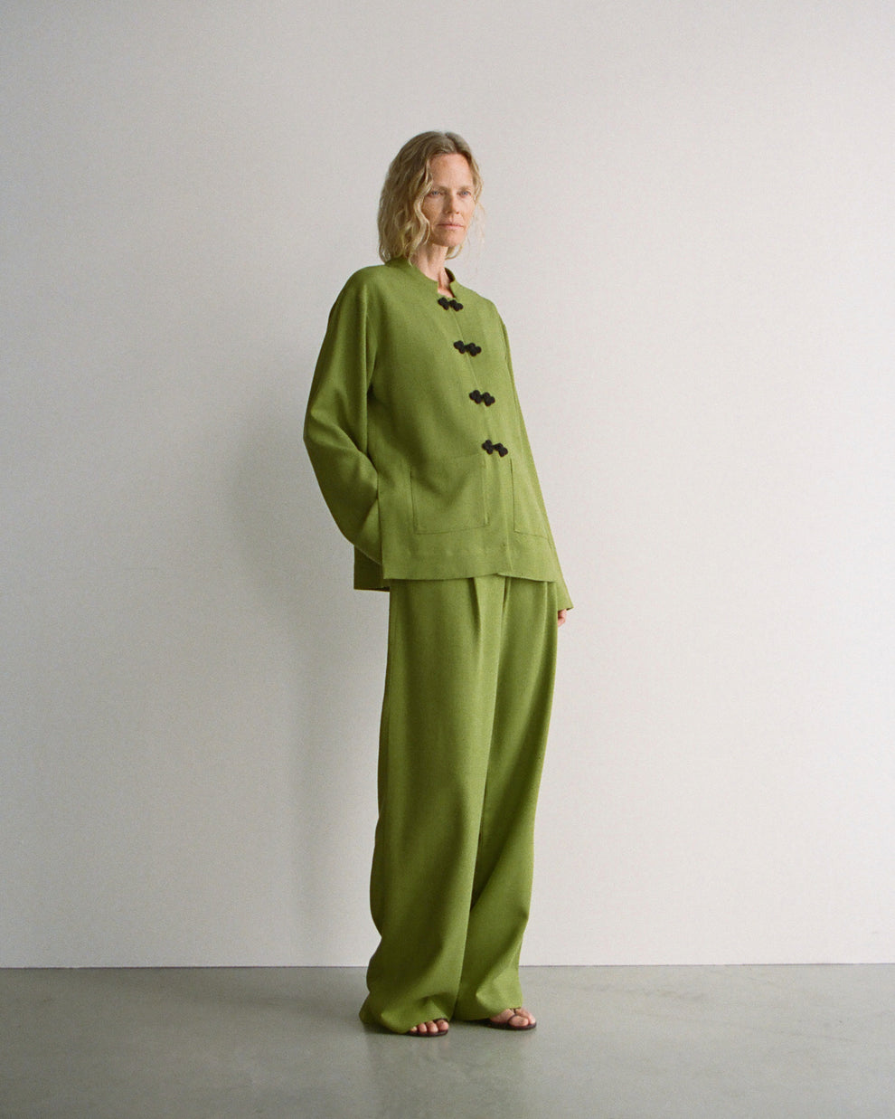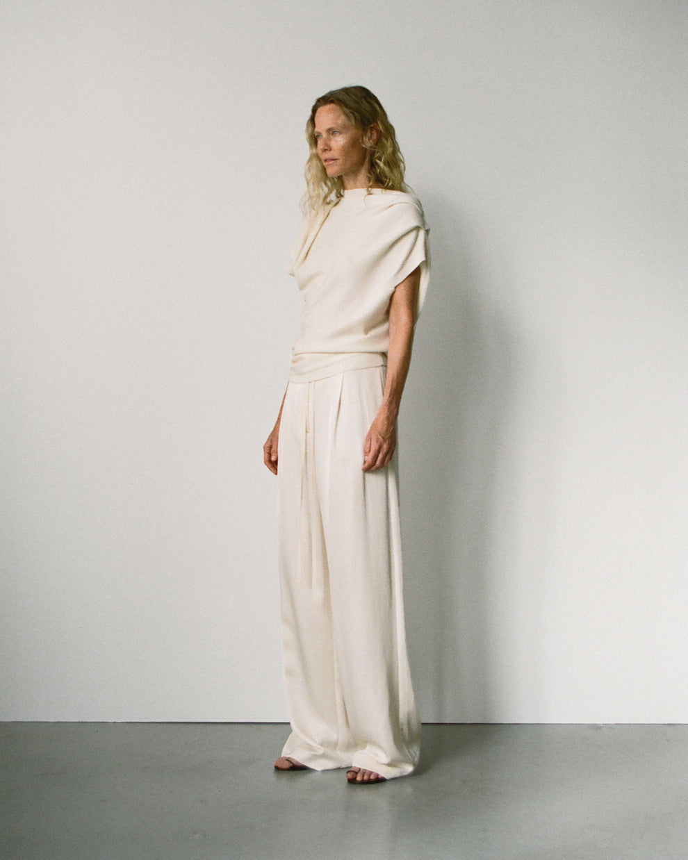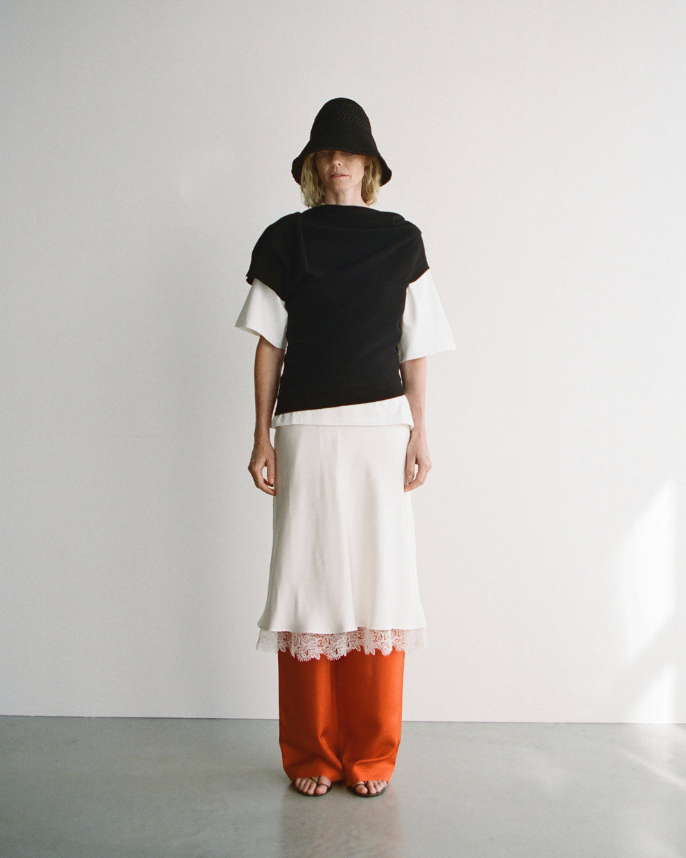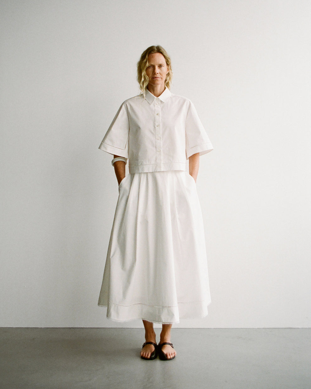 The Spring Summer 25 collection was inspired by the idea of bringing the comfort of homewear into the garden, stepping outside in your lace lingerie or a silky morning robe, appreciating blossoming flowers, the soft green grass beneath your feet, the sun’s warm embrace on your skin, and a gentle breeze that softly moves your garments. Vintage tablecloths and embellished cotton napkins set the stage for a picnic under the open sky, creating an intimate tableau where family and friends come together to enjoy seasonal produce, share time, and create cherished memories.