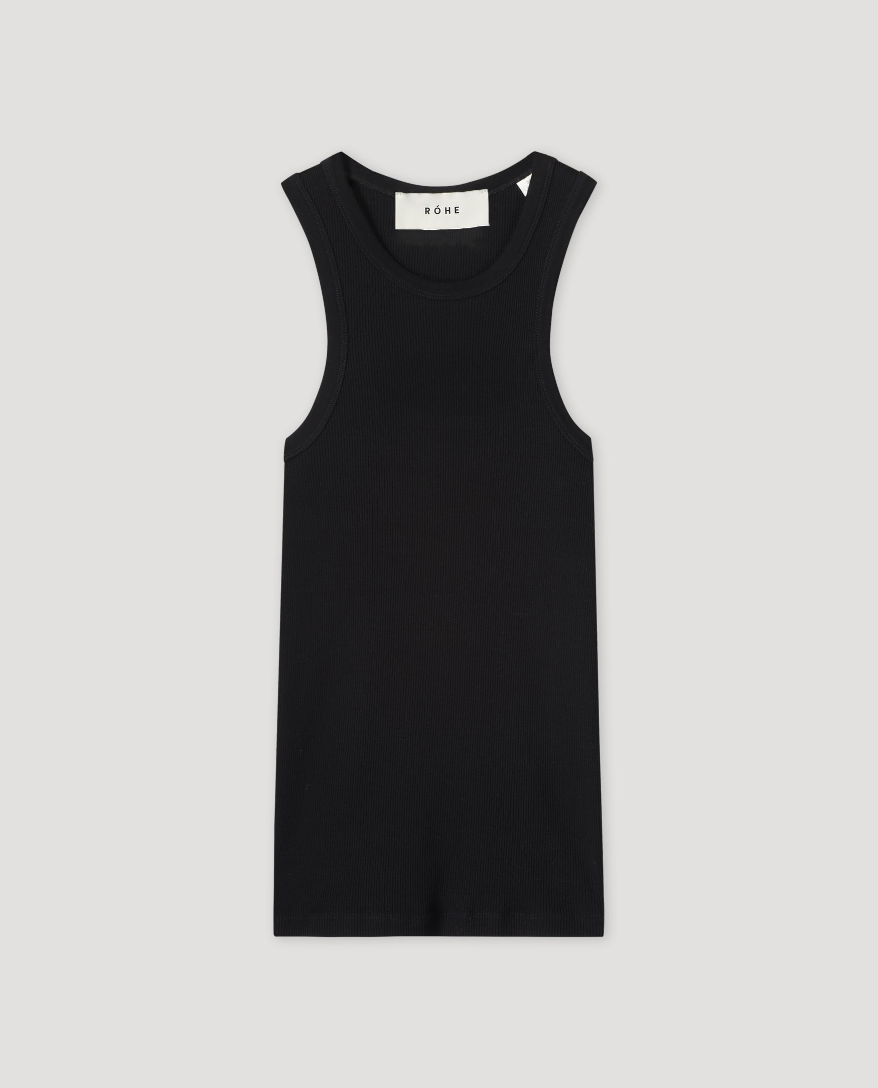 A racerback tank top cut from 100% mercerised cotton rib. At staple in any wardrobe.