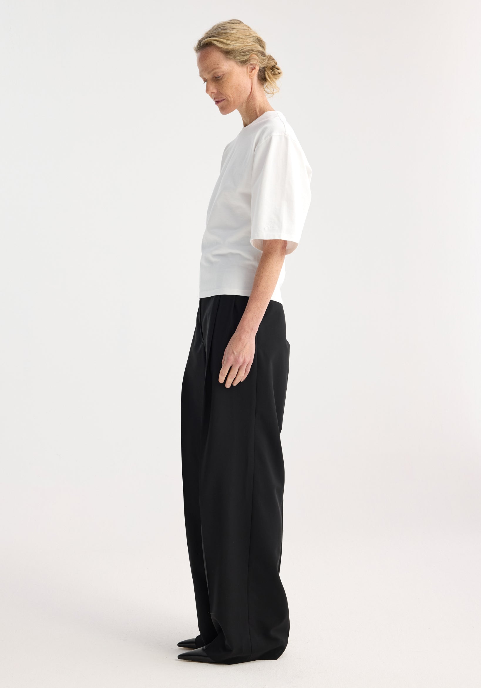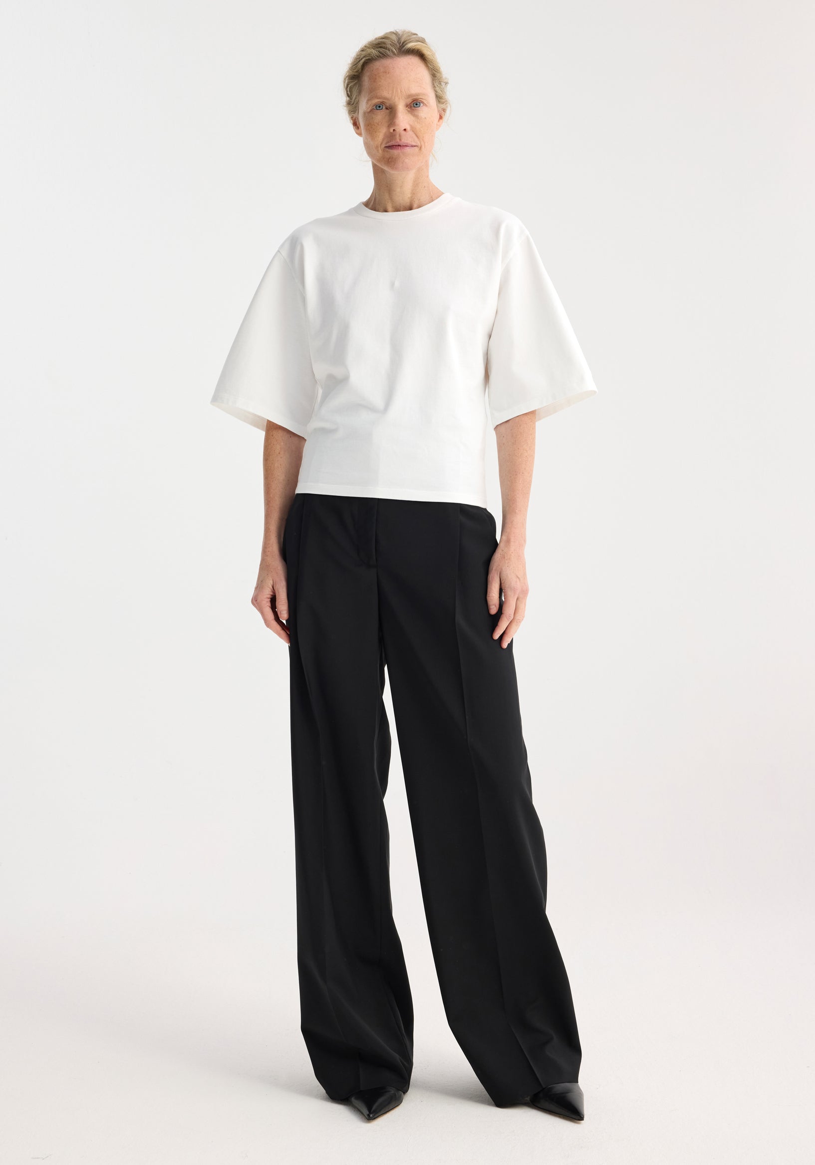 An everyday essential elevated by its sharp silhouette and crisp cotton fabric, a versatile piece that pairs effortlessly. The design features a crew neck, tapered elbow-length sleeves with small logo embroidery, and a subtle drop shoulder.