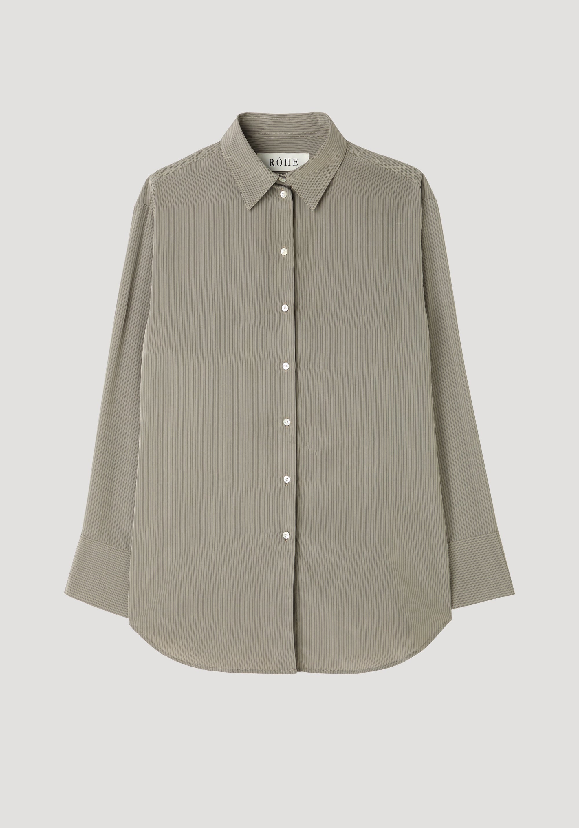 A button-down shaped shirt with a relaxed hourglass silhouette. Designed with extended sleeve plackets that open above the elbow for a contemporary, airy detail, it’s finished with mother-of-pearl buttons and a softly rounded hem.