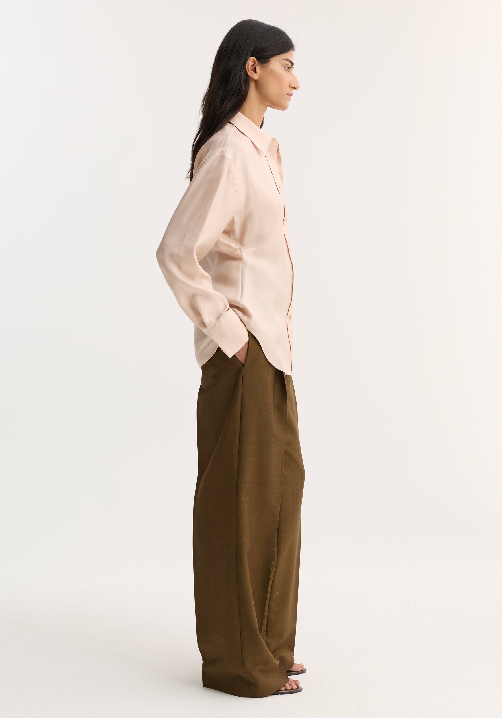 A button-down shaped shirt in a relaxed hourglass silhouette, crafted from fluid rose silk. Finished with a rounded hem, it brings soft structure and refined ease to everyday dressing.